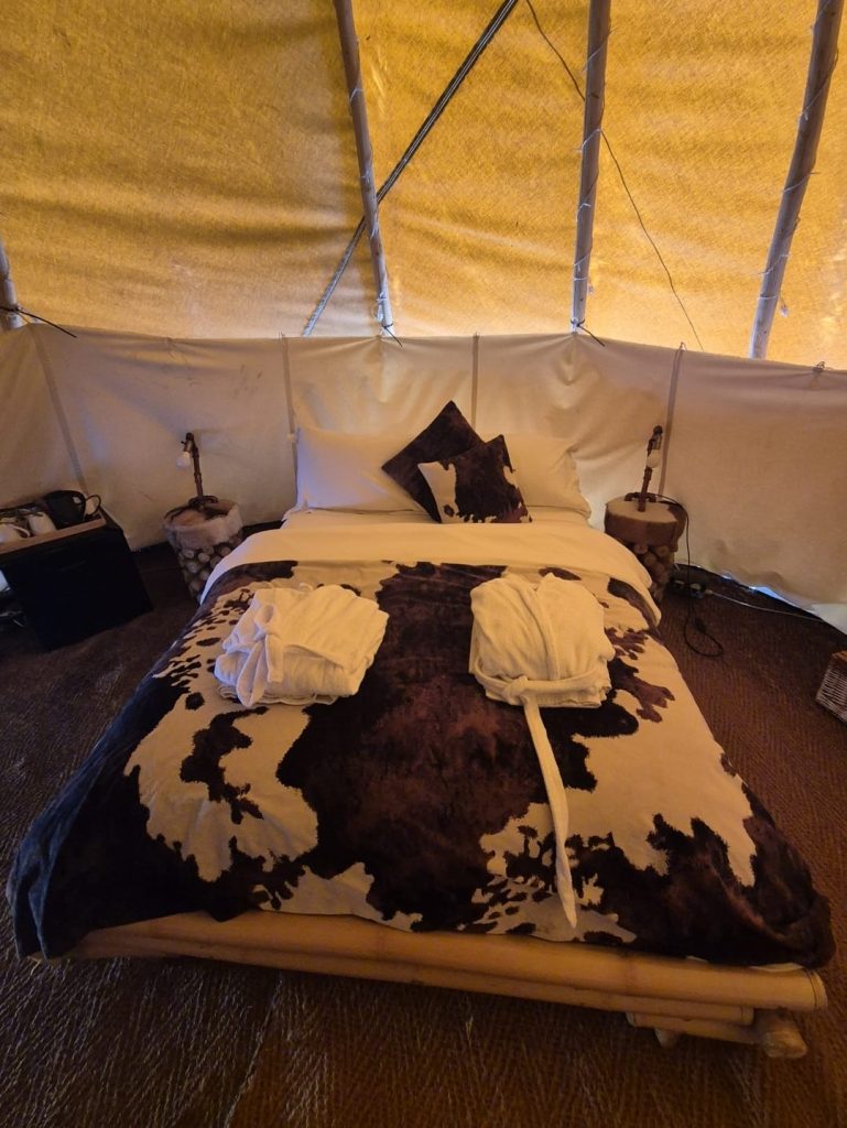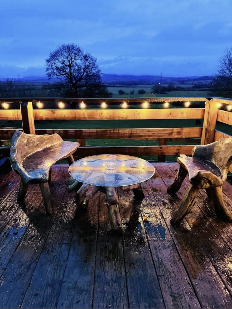 Geronimo Tipi is a cosy environment with a wood burning stove and comfy king bed , mini fridge freezer, bedside lights, tea & coffee making facilities and a wifi speaker. Outstanding views and an undercover Hot tub with twinkly lights with the sounds of nature all around. Perfect for a date night.
